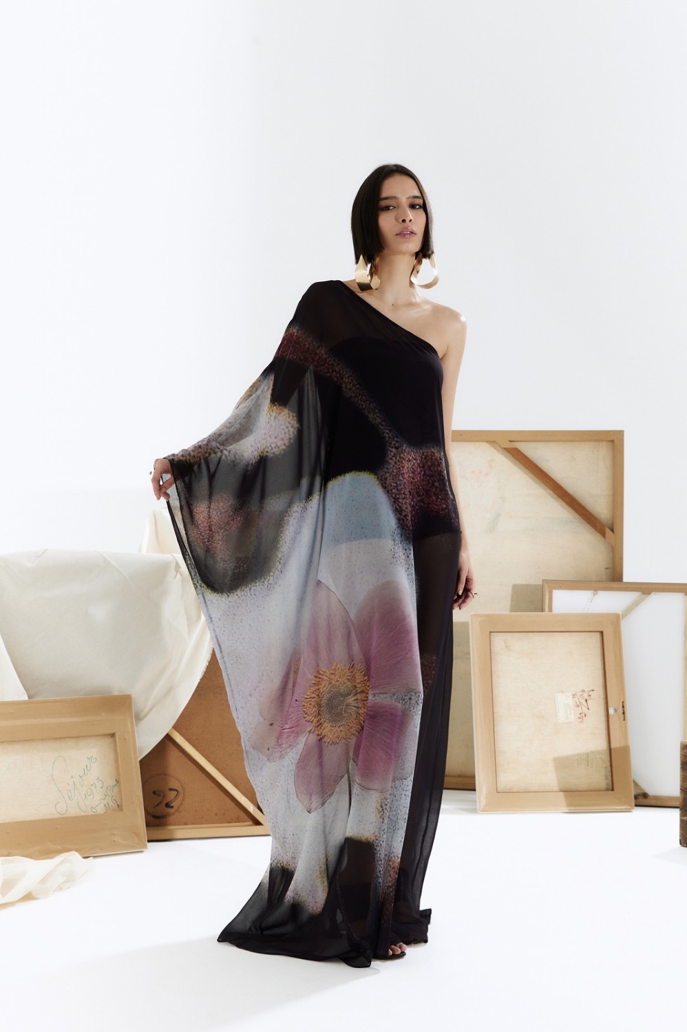 Vestido em chiffon com transparência, modelagem assimétrica estilo túnica e estampa localizada. A peça possui uma manga só e acompanha um macaquinho curto preto tomara-que-caia como forro.